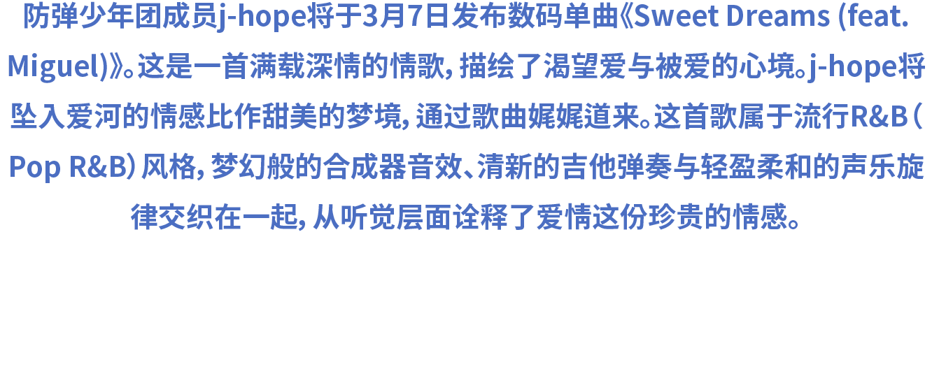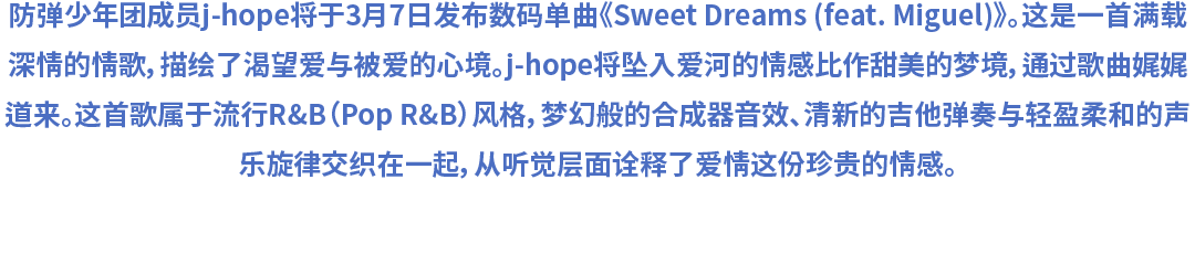 防弹少年团成员j-hope将于3月7日发布数码单曲《Sweet Dreams (feat. Miguel)》。这是一首满载深情的情歌,描绘了渴望爱与被爱的心境。j-hope将坠入爱河的情感比作甜美的梦境,通过歌曲娓娓道来。这首歌属于流行R&B(Pop R&B)风格,梦幻般的合成器音效、清新的吉他弹奏与轻盈柔和的声乐旋律交织在一起,从听觉层面诠释了爱情这份珍贵的情感。