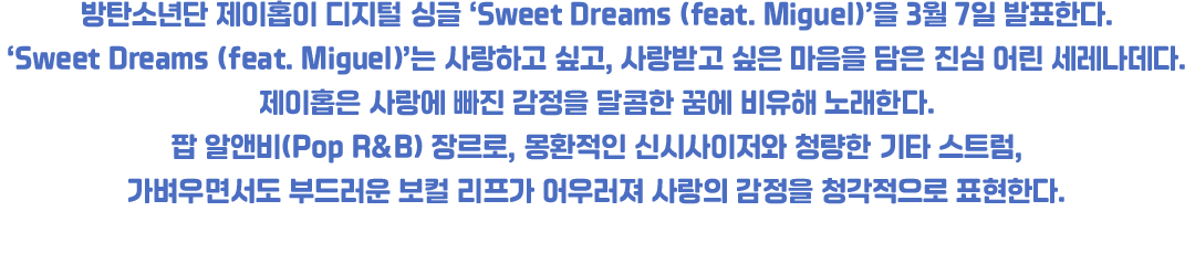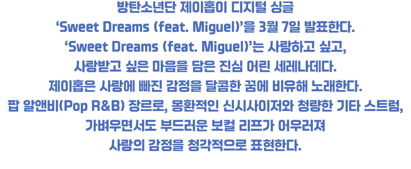 방탄소년단 제이홉이 디지털 싱글 ‘Sweet Dreams (feat. Miguel)’을 3월 7일 발표한다. ‘Sweet Dreams (feat. Miguel)’는 사랑하고 싶고, 사랑받고 싶은 마음을 담은 진심 어린 세레나데다. 제이홉은 사랑에 빠진 감정을 달콤한 꿈에 비유해 노래한다. 팝 알앤비(Pop R&B) 장르로, 몽환적인 신시사이저와 청량한 기타 스트럼, 가벼우면서도 부드러운 보컬 리프가 어우러져 사랑의 감정을 청각적으로 표현한다.